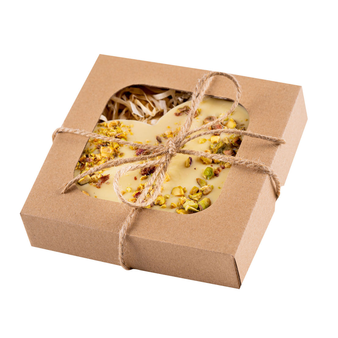 Doskonały smak i aromat belgijskiej białej czekolady w kształcie serca z dodatkiem prawdziwego miodu wielokwiatowego, pięknie ozdobiony pistacjami, w naturalnym kraftowym pudełeczku to świetny prezent dla ukochanej osoby. Biała czekolada to źródło witamin D, E i K, a także witamin z grupy B. Działa ona kojąco na układ nerwowy – minimalizując stres a także pozytywnie wpływa na sprawność koncentracji, a do tego cudownie smakuje. Naturalnie, zdrowo i słodko.