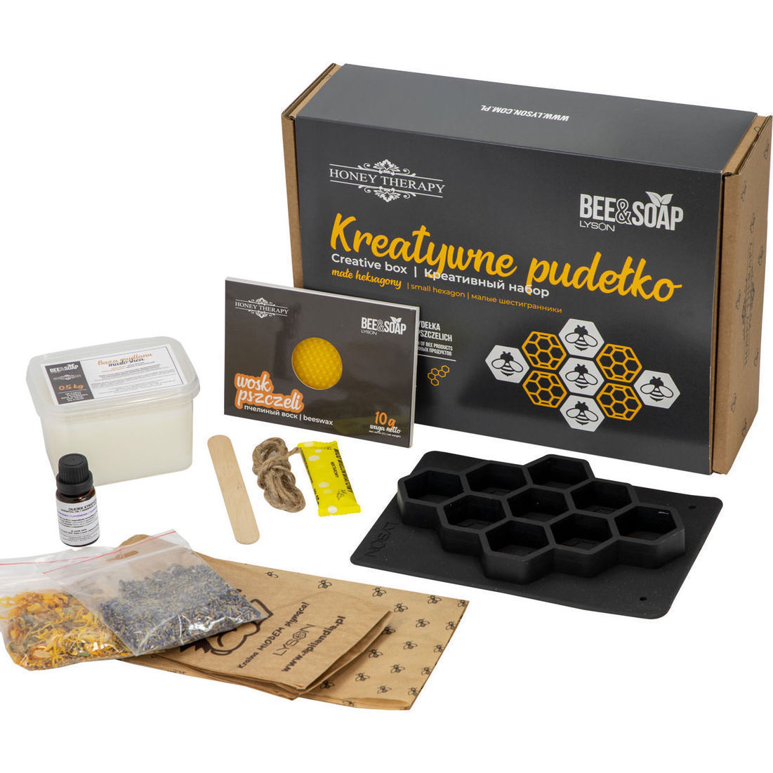Mydełka jak i samo kreatywne pudełko, może być świetnym prezentem wręczanym podczas uroczystości okolicznościowych, z okazji Świąt lub eventów firmowych – możliwości jest bardzo wiele – wszystko zależy od Państwa potrzeb. Proponowany kreatywny zestaw to nietuzinkowy i innowacyjny produkt dostępny dla każdego. Wytworzysz dzięki niemu zwracające uwagę, stylowe i efektowne wyroby, dbające o Twoją skórę. Dodatkowo w naszej ofercie dostępne są komponenty, dzięki którym rozwiniesz i uzupełnisz niniejszy zestaw o wiele nowych możliwości kompozycyjnych. Formy zawartej w zestawie, używać można do wykonywania elementów dekoracyjnych z surowców takich jak gips ceramiczny, beton kreatywny, żywica epoksydowa, baza mydlana, parafina, wosk sojowy oraz wosk palmowy. Moc kwiecistej łąki oraz siła naturalnych składników to dwa kluczowe elementy na których bazujemy w przypadku tworzenia nowych prozdrowotnych, pszczelich produktów. Natura doskonale wie co jest dla nas dobre. Dlatego stosuj sprawdzone produkty pszczele, pochodzące od polskiego producenta. Zaufaj naturze – zaufaj markom BEE & SOAP LYSON i Honey Therapy.Składniki