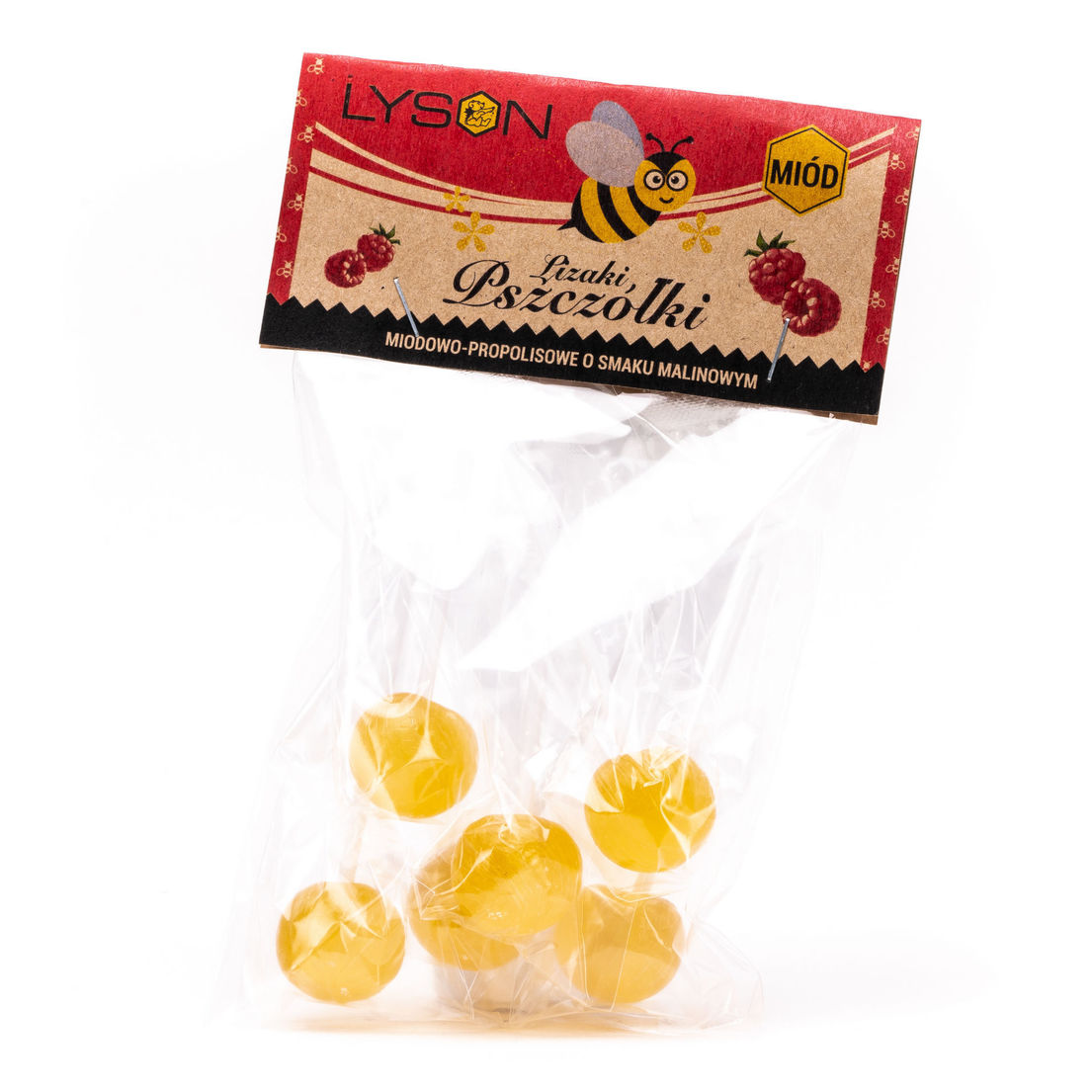 Charakterystyka produktu: lizaki o smaku malin, miodu i propolisu, wytwarzane z naturalnych składników w których prym wiedzie miód wielokwiatowy, cukier brzozowy oraz propolis