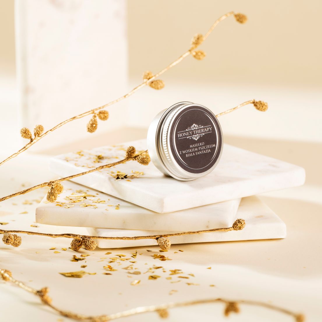 Masełko do ust serii Biała Fantazja zawiera bogatą kompozycję naturalnych olejów oraz maseł roślinnych. Subtelny zapach piżma podkreśla jego wyjątkowość. Cudownie nawilża i odżywia. Dzięki zawartości wosku pszczelego pozostawia na skórze delikatną warstwę, która zapewnia ochronę przed negatywnymi czynnikami zewnętrznymi, takimi jak: niska lub wysoka temperatura, promieniowanie UVA i UVB oraz wiatr. Regularne stosowanie sprawia, że skóra ust będzie jak najlepiej nawilżona i odżywiona.