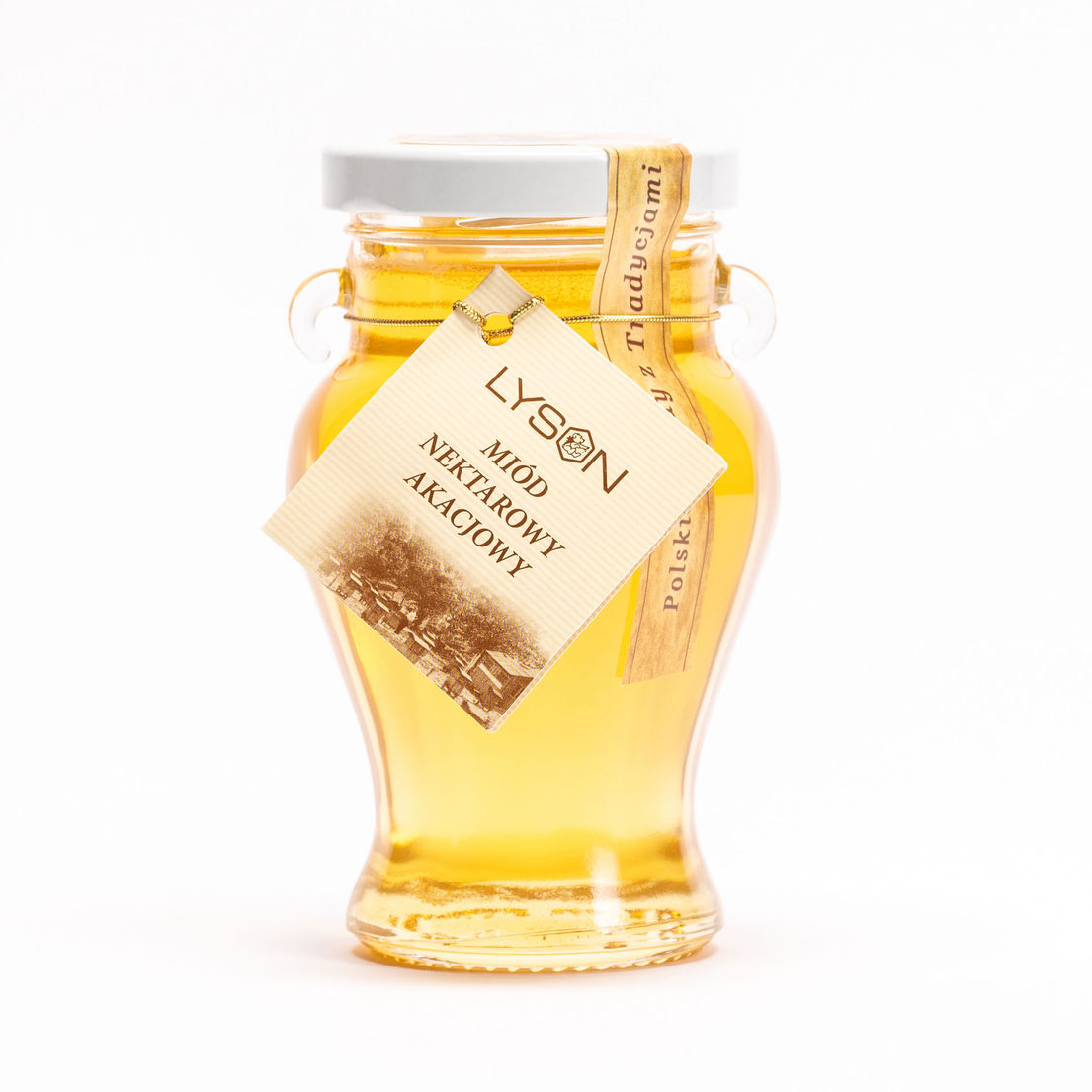 Charakterystyka produktu: złocisty i naturalny nektarowy miód akacjowy wytwarzany w tradycyjnej Pasiece LYSON, od lat szczycimy się produktem najwyższej jakości utrzymując wysoki poziom naszych produktów