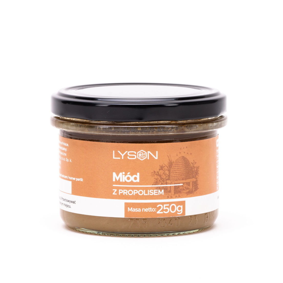 Opakowanie i przechowywanie: propolis z miodem podany jest w szklanych słoiczkach z systemem zamykania twist off, przechowuj produkty miodowe w suchym i ciemnym miejscu, masa netto 0,25 kg