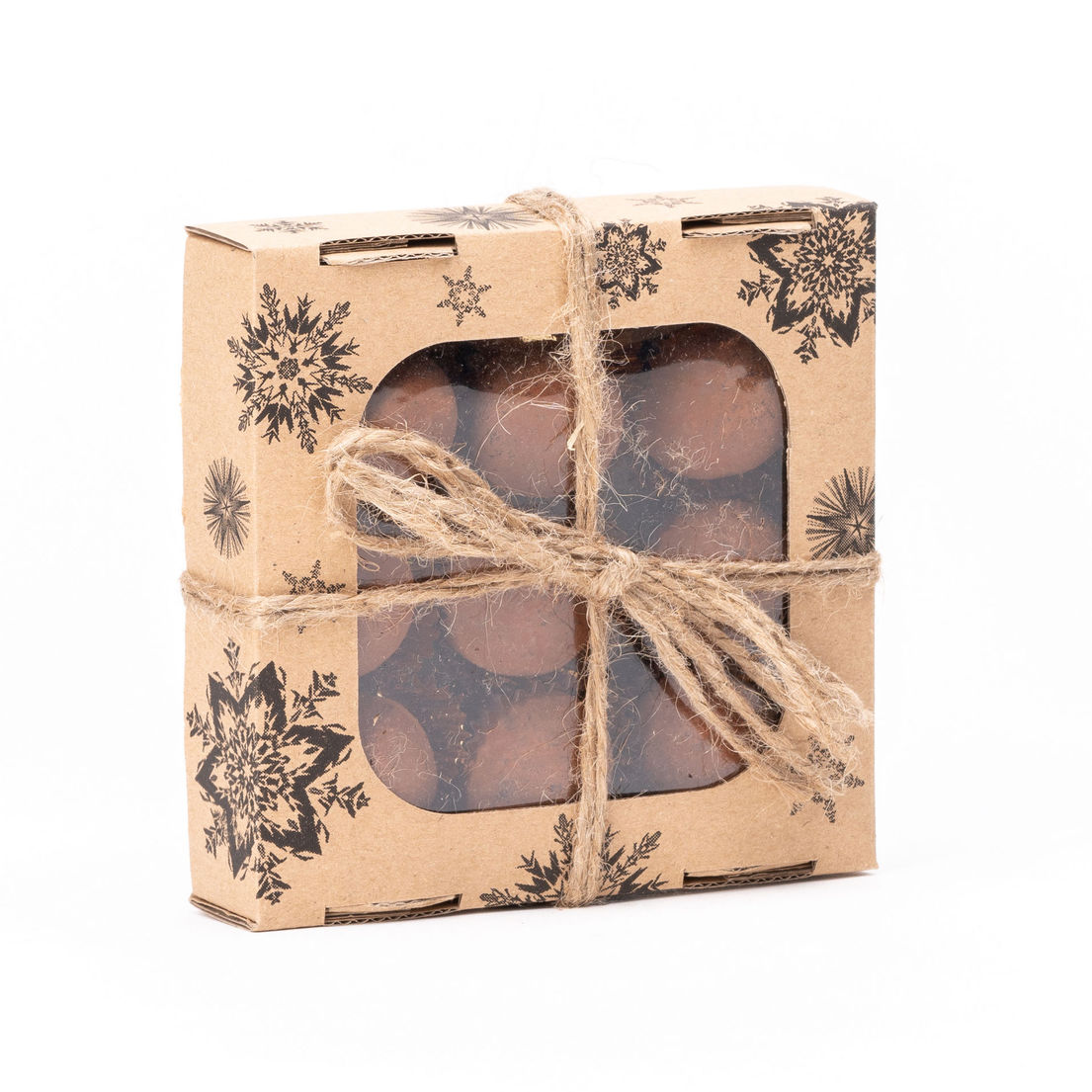 Opakowanie i przechowywanie: zgrabne kartonowe pudełeczko przewiązane dratwą retro, okienko wizyjne prezentujące trufle, data ważności to 6 miesięcy od daty produkcji, waga netto 170 g