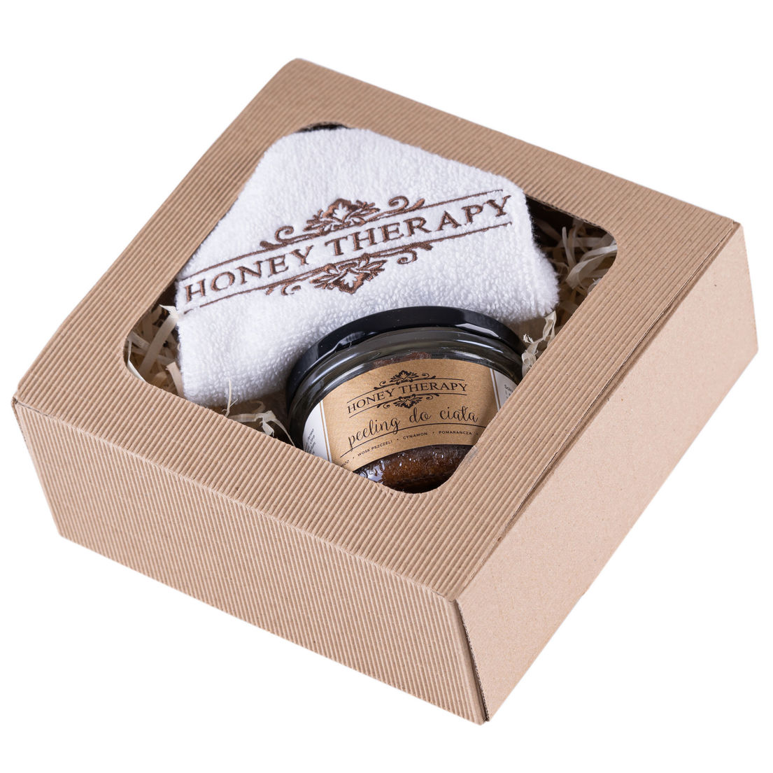 Zestaw zawiera: pudełko, peeling pomarańcza/chili, ręcznik z logo honey therapy + sianko