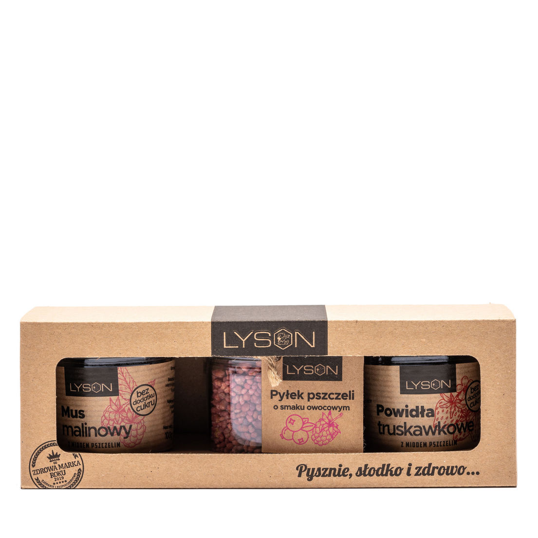 Produkty pszczele to podstawa naszych wyrobów. Jednocześnie stworzone specjalnie dla Was zestawy to wyśmienite połączenie tradycji z nowoczesnym podejściem do żywienia. W skład niniejszego zestawu wchodzi mus malinowy, pyłek pszczeli o smaku owocowym oraz powidła truskawkowe. Mus malinowy powstał całkowicie bez użycia syntetycznego cukru. Pszczeli pyłek w owocowym wydaniu to bogate źródło witamin i aminokwasów, natomiast truskawkowe powidła to połączenie truskawek (90%) ze złocistym miodem wielokwiatowym. Stosując nasze wyroby dbasz o zdrowie oraz możesz rozsmakować się w naturze. W produktach Pasieki LYSON nie stosujemy żadnych ulepszaczy, ani żadnych wspomagaczy. Te pyszności powstają tylko i wyłącznie na bazie naturalnych i zdrowych składników.