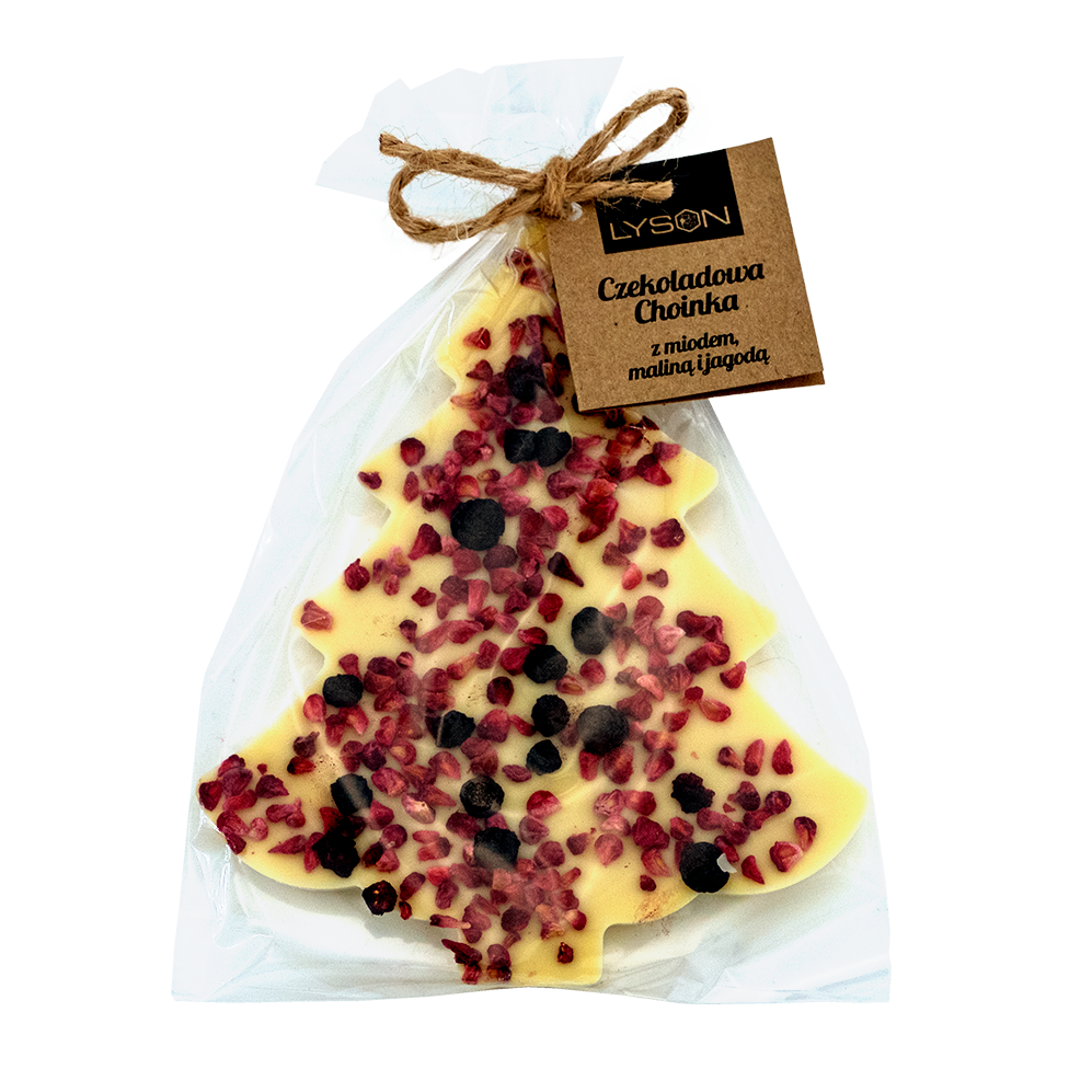Składniki: czekolada biała: (cukier, tłuszcz kakaowy, MLEKO pełne w proszku, emulgator: lecytyny (SOJA), aromat), malina