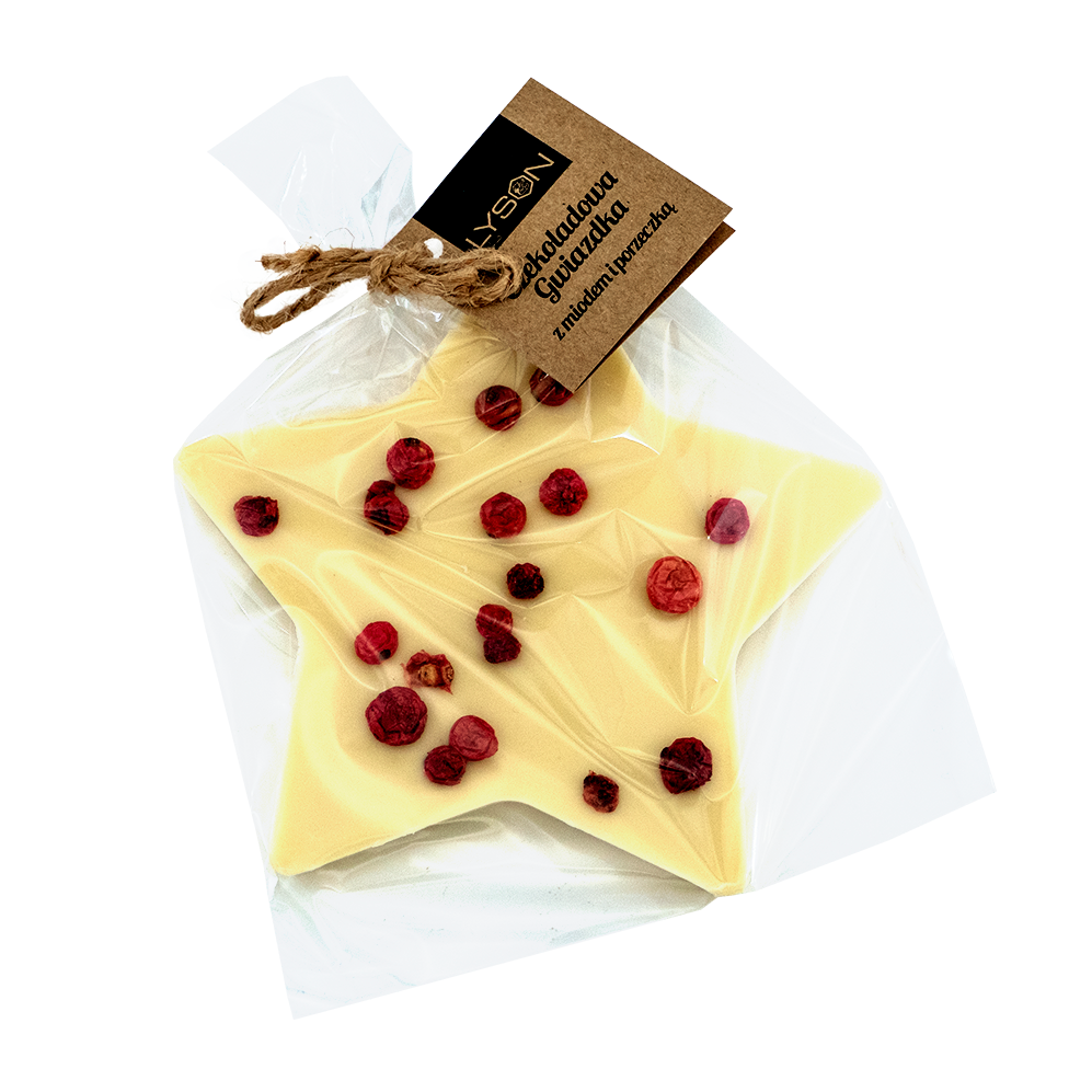 Gwiazdka z białej czekolady z dodatkiem miodu posypana porzeczkami liofilizowanymi.