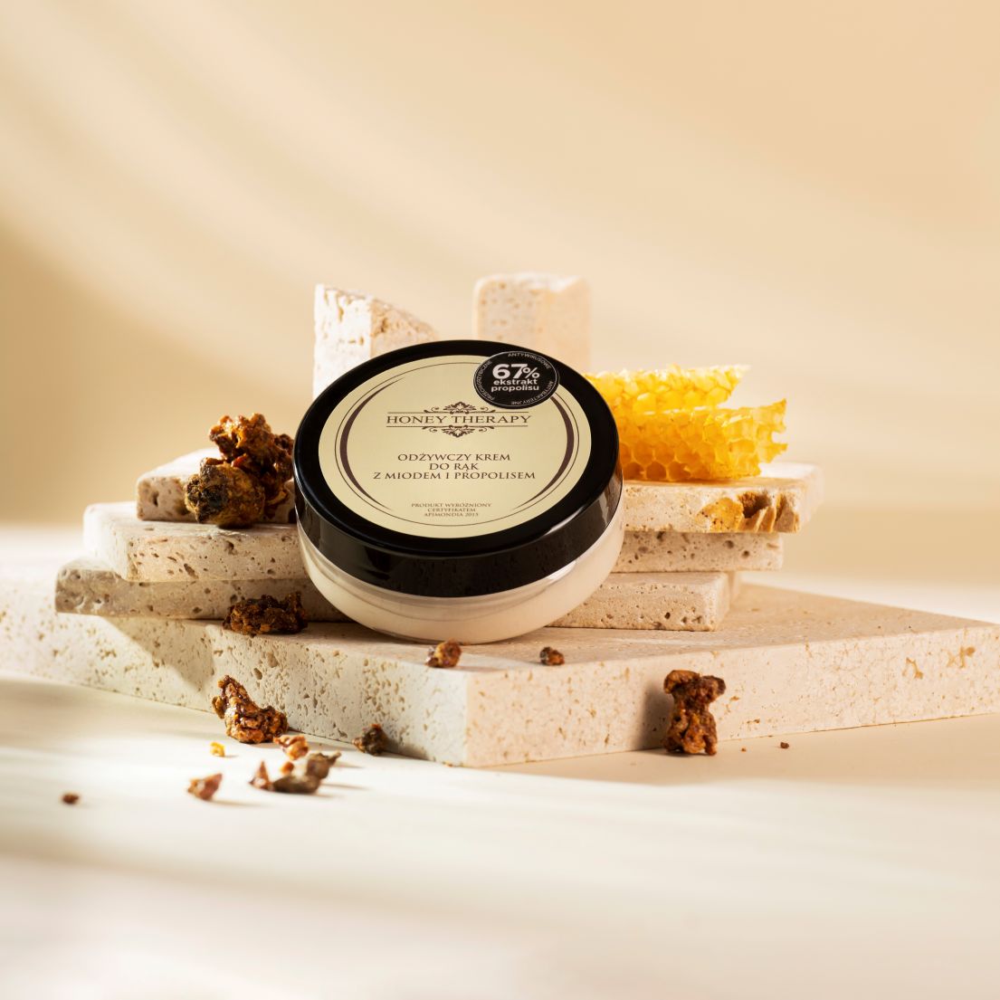 Masz bardzo suchą skórę dłoni, problem z pękającym naskórkiem a może Twoje dłonie narażone są na niekorzystny wpływ czynników zewnętrznych? W naszej ofercie znajdziesz krem idealny dla Twoich potrzeb, który ma bardzo dobra opinię wśród klientów i został doceniony za swój bogaty skład i działanie przez Międzynarodową Organizację Związków Pszczelarskich Apimondia w Korei 2015 brązowym medalem. Połączenie produktów pszczelich miodu i propolisu z masłem Shea, olejem z awokado i mocznikiem. Prosty a zarazem idealny skład kremu sprawia, że przeznaczony jest dla każdego typu skóry również tej problematycznej. Nawilża, odżywia, pielęgnuję i poprawia kondycję skóry dłoni. Użyty w składzie 67% koncentrat propolisu ma działanie antybakteryjne, antywirusowe i przeciwgrzybicze, jednocześnie regeneruje i przyspiesza gojenie się ran. Miód z racji bogatego w witaminy i mikroelementy składu odżywia i nawilża. Poprawa wyglądu dłoni widoczna już po pierwszym użyciu.