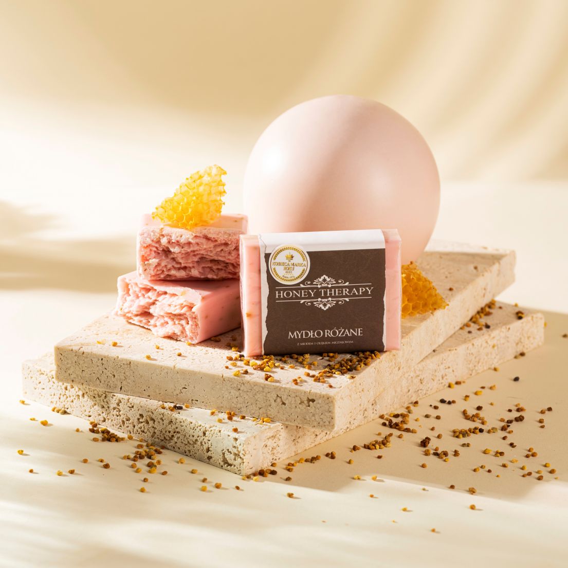 Mydło różane z dodatkiem płatków róż i naturalnego olejku migdałowego, wzbogacone miodem. Nawilża, odżywia , zmiękcza  naskórek. Z racji dodanych zmielonych płatków róż i miodu delikatnie peelinguje skórę poprawiając krążenie i pobudzając naskórek do odnowy. Idealne do codziennej pielęgnacji każdego typu skóry. Dzika róża, miód i olejek migdałowy korzystnie wpływają na pielęgnację skóry trądzikowej.