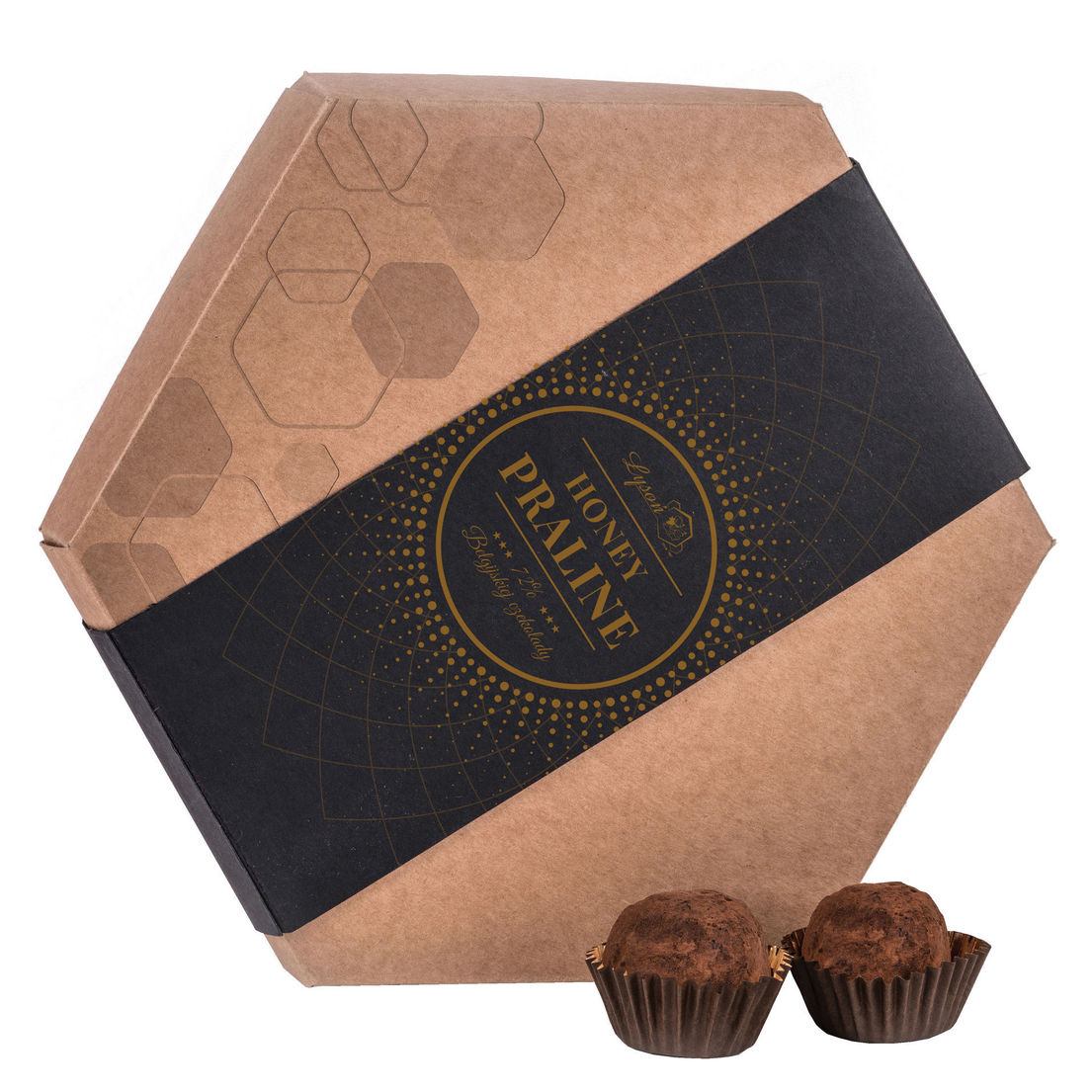 Charakterystyka produktu: miodowe trufle to mini praliny wytwarzane metodą tradycyjną na bazie miodu i kakao z dodatkiem brandy, ich barwa to ciemny brąz – jest wynikową użytych składników