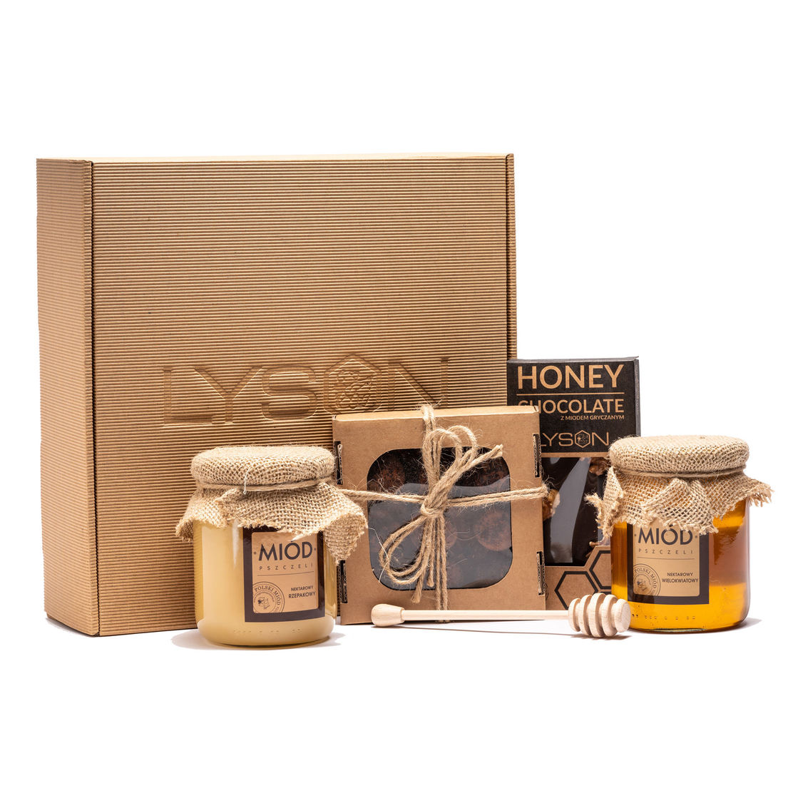 Nasze zestawy to doskonale dobrane kompozycje, które mogą zaskoczyć każdego smakosza. Znajdziecie w nich bogactwo kwietnej łąki oraz naturalne i prozdrowotne składniki. Optymalne opracowanie zestawu pozwala na uzyskanie niesamowitego efektu podczas najbardziej wyszukanych eventów okolicznościowych. Zestawy Pasieki LYSON to bogactwo smaku oraz składników odżywczych. W skład niniejszego zestawu wchodzi m. in. stylowe i delikatne pudełko oraz dwa rodzaje pełnowartościowych miodów. Miód wielokwiatowy to jeden z najbardziej lubianych miodów wśród najmłodszych. Stosowany również z powodzeniem przez seniorów. Zawiera fosfor, potas oraz żelazo a także enzymy i liczne aminokwasy. Drugim rodzajem miodu w zestawie to miód rzepakowy, posiadający żółtawo-jasną barwę. Dość szybko krystalizuje, zmieniając po krystalizacji swoją barwę na kremową. Nawet w takim stanie świetnie rozsmarowuje się na pieczywie.