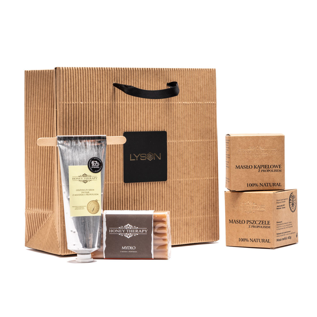 Mydło charakteryzuje się brakiem zawartości w jego składzie barwników. Kolor mydła uzyskaliśmy dzięki naturalnym surowcom a są nimi m. in. miód i propolis. Całość kompozycji wieńczy krem propolisowy do rąk o działaniu nawilżającym, zmiękczającym, natłuszczającym oraz odżywczym. Niweluje istniejące problemy z pękaniem naskórka. Międzynarodowa Organizacja Związków Pszczelarskich Apimondia doceniła nasz krem w Korei, w roku 2015. Kompozycja uzyskała brązowy medal za prozdrowotny i naturalny skład. Nadaje się do każdego rodzaju skóry posiadając w swym składzie w pełni naturalne składniki, m. in. masło Shea, olej z awokado, miód i propolis. Możecie być pewni, że wygląd dłoni poprawi się już po pierwszym użyciu kremy Pasieki LYSON. W skład zestawu wchodzi również stylowa i dodająca uroku całej kompozycji torebka.